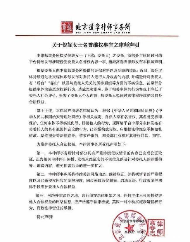 近日,编剧古二公开了《繁花》王家卫导演与他人的谈话录音,其中所谓私人评价引发八卦话题。随后北京道章律师事务所受倪妮委托发布声明,明确否认“有后台”“有靠山”等不实言论,称相关内容系编造的人身攻击信息,存在恶意拉踩行为,已严重侵犯倪妮的名誉权,降低其社会评价。也有网友提出疑问,倪妮该告谁?