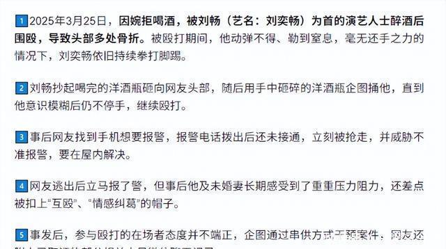 据南都娱乐报道,刘奕畅本人因此事已被关入看守所,涉及他的案件部分目前已移送至人民法院,等待刑庭排庭审判,其他同案人员则处于取保候审状态。 事件源于2025年3月25日的一场聚会,据受害者描述,只因婉拒喝酒,竟引来刘奕畅等人的不满,随后升级为一场暴力围殴。